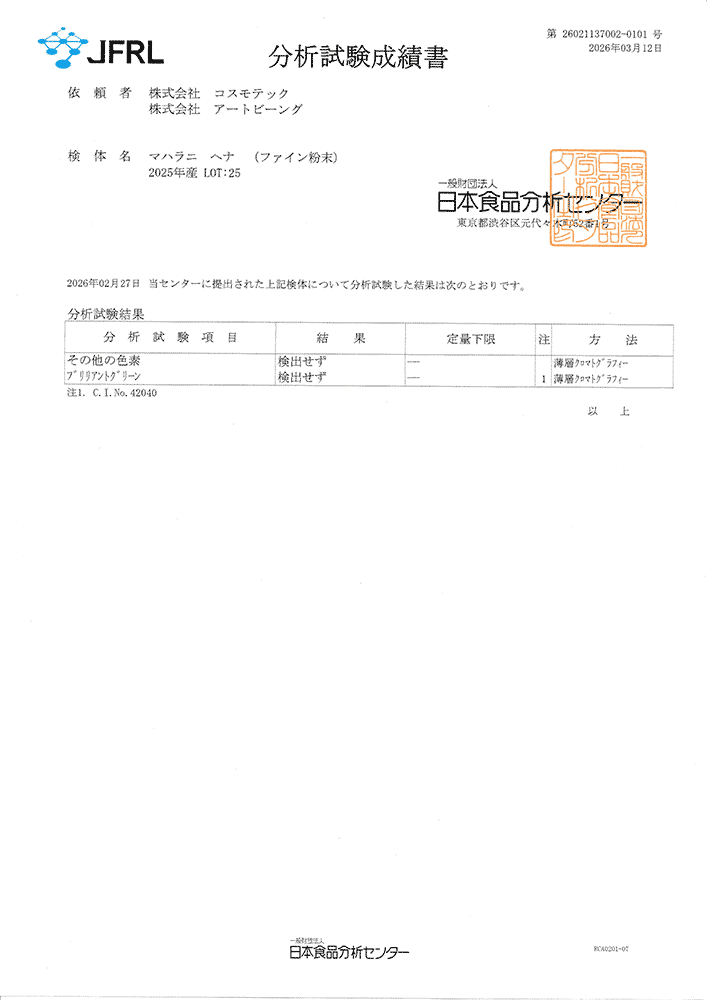 弊社では製造にいたるまでに重金属、ローソニア色素などの検査を重ねております。弊社では、荷物が日本に到着してからの検査では十分でないと考えており、インドにて製品化が完了した段階、インドから荷物が出荷される前に、現地の検査機関 SGS研究所インド支社(本社:スイス・ジュネーブ)にて最新の検査機器による詳細な検査を実施しております。その公正中立な検査結果は世界に通用し、日本の食品分析センターと同等の信頼性とお考えください。
