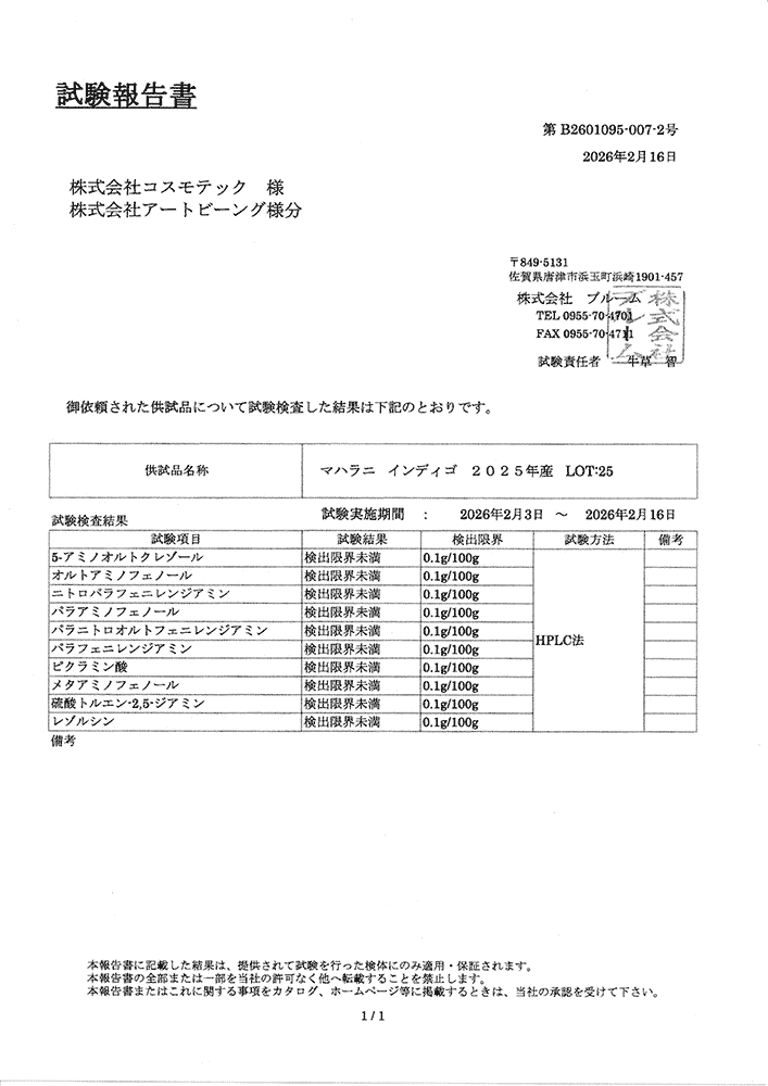 上写真例ではヘナ染め1時間、インディゴ後染め30分。ダークブラウン希望の場合はインディゴ後染め20分程度。染め時間調整でブラウン、ダークブラウン、ブラックへ染まります。ただし、髪質や髪の状態で染め時間は調整が必要。