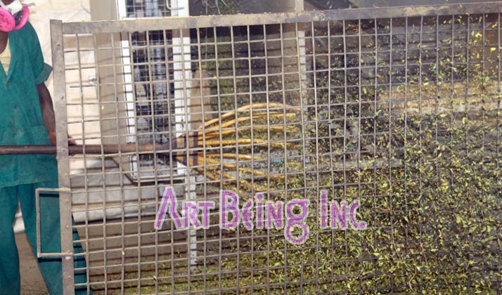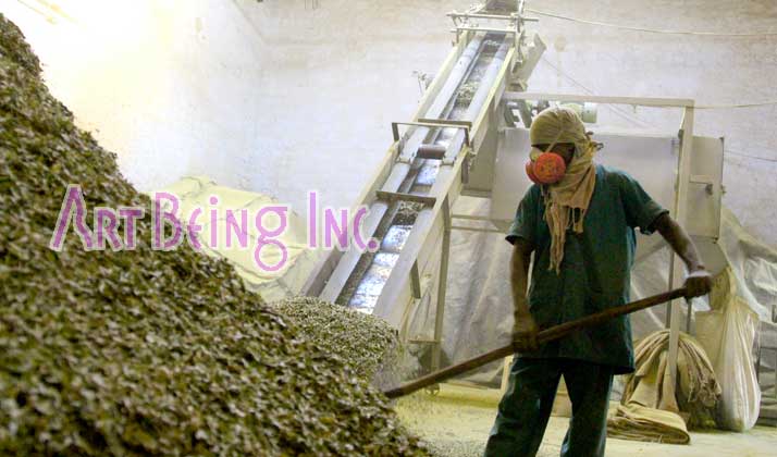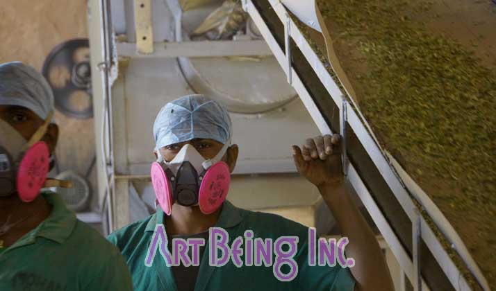ヘナの葉をベルトコンベヤーに落とす作業をするだけで砂塵が舞い上がり、呼吸が苦しくなります。この砂分除去工程での作業中、作業従事者が砂塵を吸引して塵肺を患う危険性があるため、アートビーングでは現地企業と検討を重ねた結果、塵肺防止のための防塵マスクを導入いたしました。
