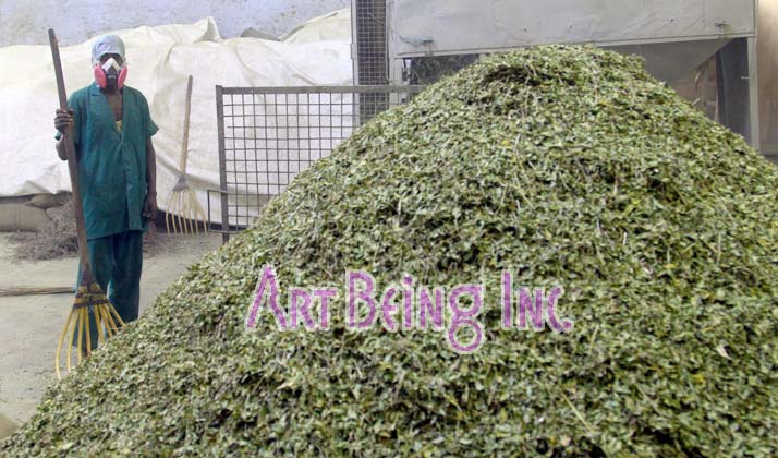 ヘナの原材料であるヘナの葉には、小枝類、砂分がたくさん混ざって工場に入荷する。