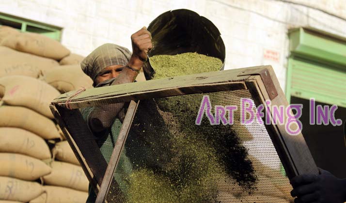 収穫されたヘナは畑で乾燥され枝葉を落とし麻袋に詰めて、公設ヘナ市場に持ち込まれ、競りにかけられる。