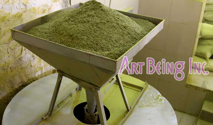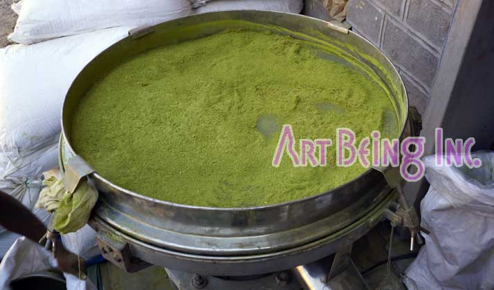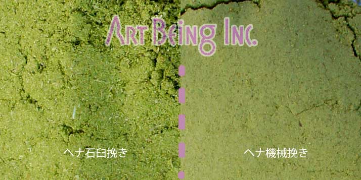 上の写真の左側が、ヘナ石臼挽きの粉末。それに対し、右側は、同じヘナの葉を高速粉末化装置で機械挽きした後の粉末。明らな違いは、多少の繊維質、木目の細かさと色です。木目は石臼挽きの場合は、もとより、高速粉末化装置のように細かな粉末にすることはできませんし、60メッシュでフルイがけをしても、多少の繊維質が残っており、この繊維質こそ石臼挽きの証です。