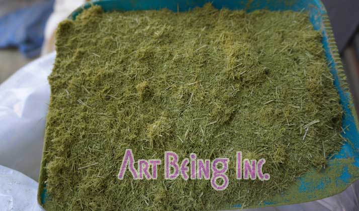 ヘナの葉は、粉末化される前に一旦、粉砕され、このような状態になります。まだ、小さな枝類が残されているため、現時点では、昔ながらの人手によるフルイがけで取り除いていますが、さらによりよい除去方法がないかを考えています。