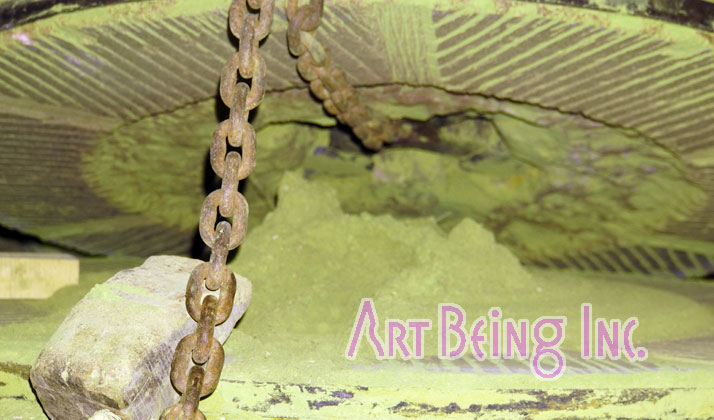 商用ヘナ石臼は、インドでも、このアートビーング所有の一台のみです。ヘナの収穫期、年1回使用されるためだけにインドの提携会社の工場内に設置してありますが、ある意味、非常に高価な設備といえるでしょう。