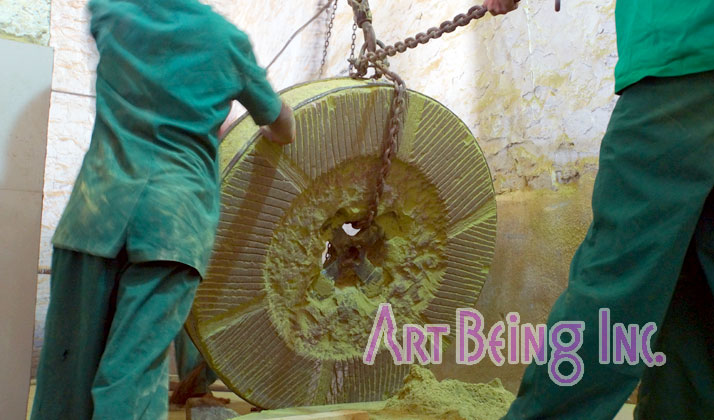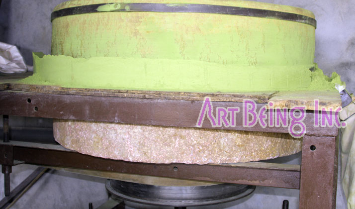 ヘナの葉を粉砕した後、石臼挽きします。石臼は、毎回使用前、目立てを行います。