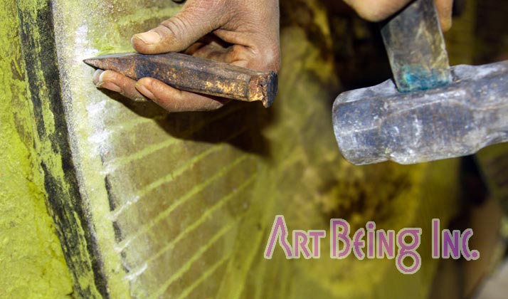 石臼の溝、ヘナの粉が流れ出るための溝を丹念に彫って、目立てを行います。