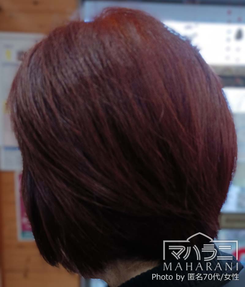Iさん70代/女性 (福島県)のマハラニヘナ石臼挽き体験談より。上の写真はヘナ+鉄アムラで小まめに半年以上、計30回重ねて染めた後の最終的な仕上がりの写真。