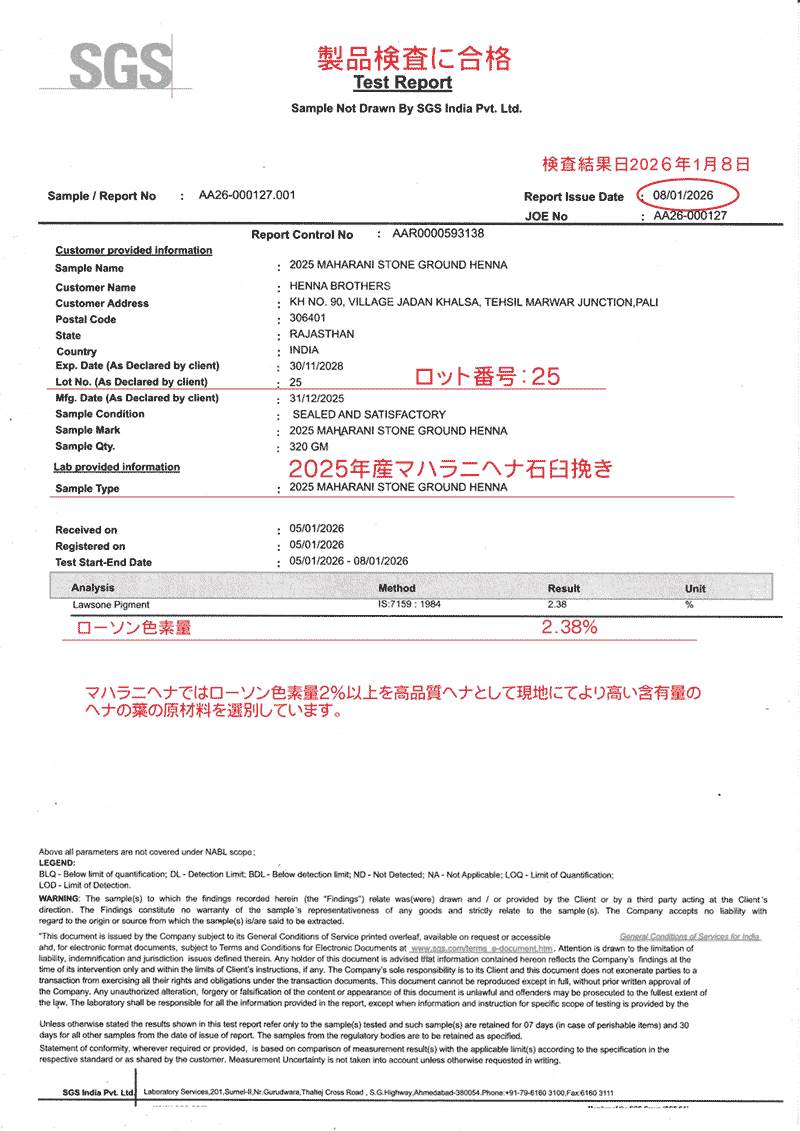 同じヘナブラザース社の農園収穫のもののため、同様の色素量になったということになるかと思います。ただ、ヘナは天候によって作柄が異なり、色素量が異なります。昨年も、一昨年も似たような天候だったため、似たような結果になったということでしょう。