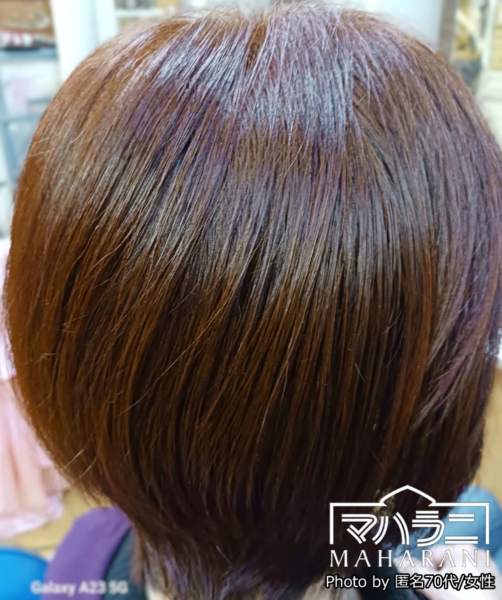今回アムラ水+石臼挽ヘナ2024年使用して染めて2日後で72回目す。前回10月の52回目(写真真下)は髪艶が少ないないようで気になりカット後に写真を撮って下さった美容師さんに聞くと今回と全く変わらない髪艶だったとの事で安心しました。