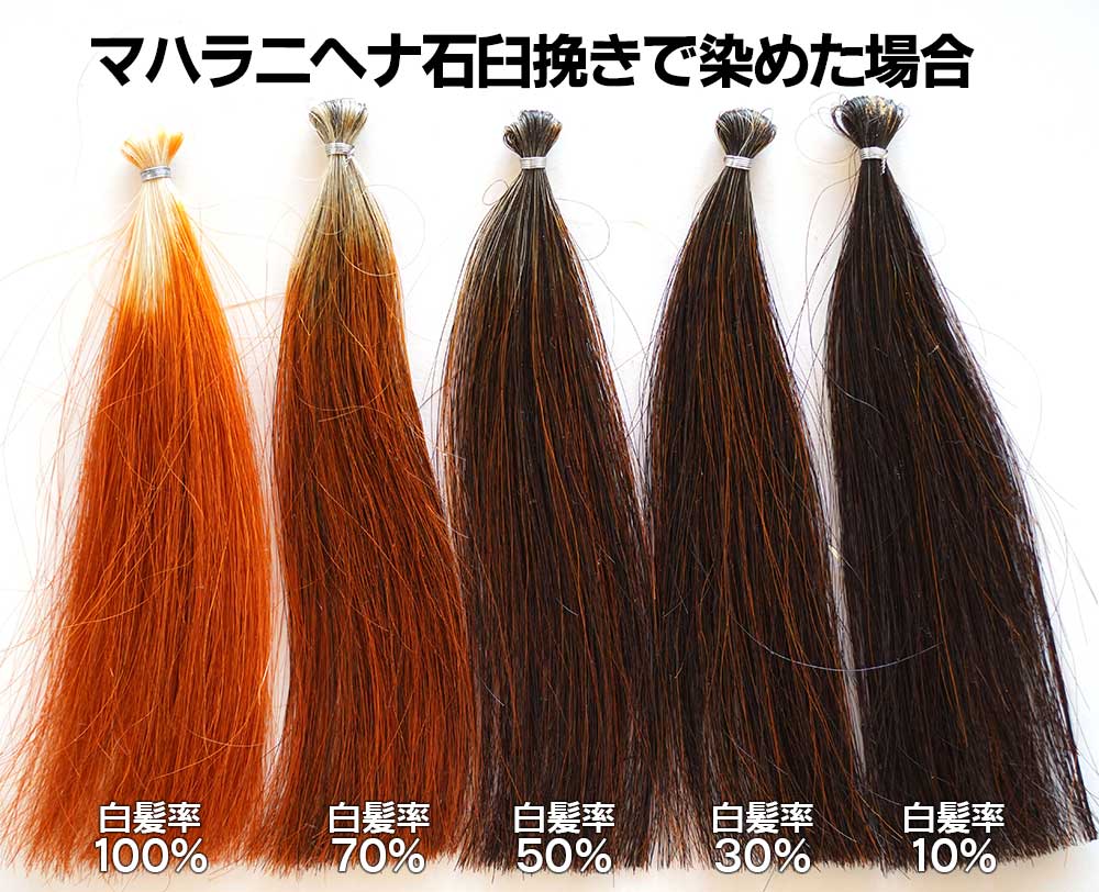 マハラニヘナ石臼挽き(ヘナ100%)で染めた場合でも、人によっては赤オレンジに見えたり、赤茶、ブラウン、ダークブラウン、あるいは黒髪に見えたりと、いろいろなヘナカラー発色をします。染める髪の白髪の量、白髪の生え方が違うからです。以下の動画をご参照ください。