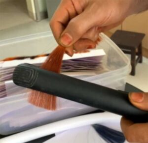 ヘナで染めた白髪束を160度~190度程度ヘアアイロンに何回か通すことで暗めにブラウン系に変色する