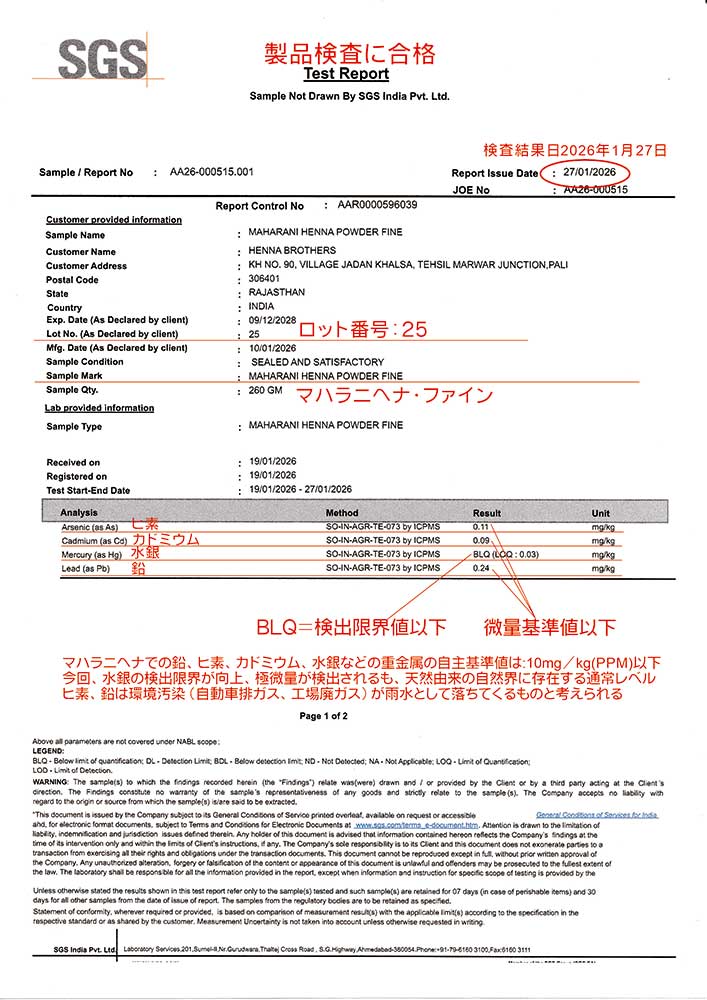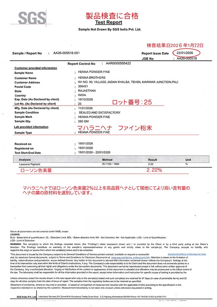 弊社では製造にいたるまでに重金属、ローソニア色素などの検査を重ねております。弊社では、荷物が日本に到着してからの検査では十分でないと考えており、インドにて製品化が完了した段階、インドから荷物が出荷される前に、現地の検査機関 SGS研究所インド支社(本社:スイス・ジュネーブ)にて最新の検査機器による詳細な検査を実施しております。その公正中立な検査結果は世界に通用し、日本の食品分析センターと同等の信頼性とお考えください。